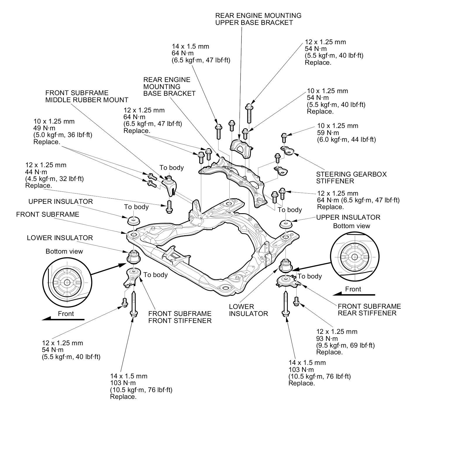 After removing the subframe mounting bolts, the front subframe middle rubber mount mounting bolts, the front subframe front stiffener mounting bolts, the front subframe rear stiffener mounting bolts, the rear engine mounting base bracket mounting bolts, and the rear engine mounting upper base bracket mounting bolts, be sure to replace them with new ones.
