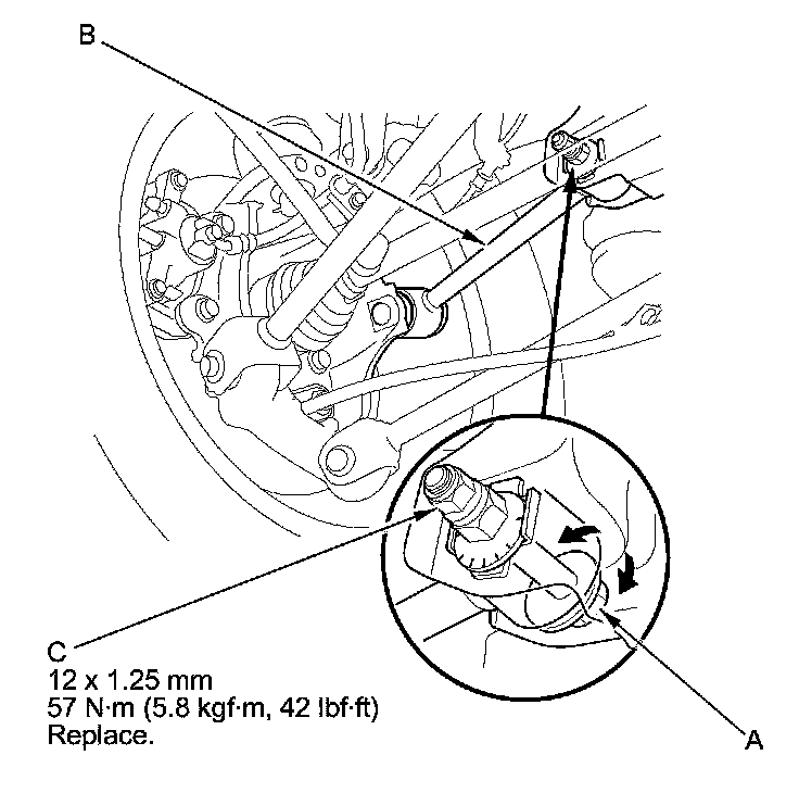 3. Hold the adjusting bolt (A) on the rear control arm (B), and loosen the self-locking nut (C).