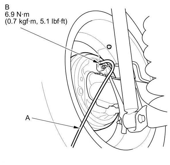 4. Attach a length of clear drain tube (A) to the bleed screw (B), then loosen the bleed screw to allow air to escape from the system. Then tighten the bleed screw securely.