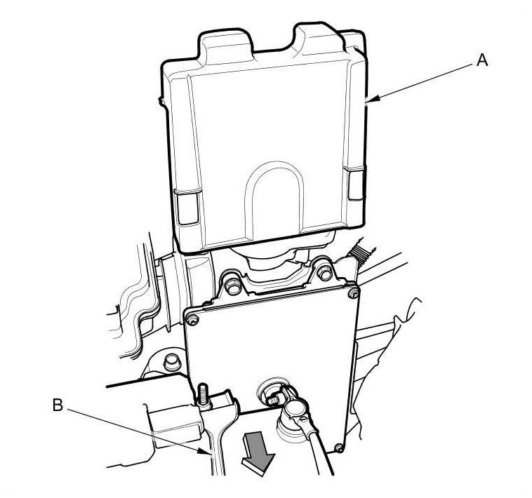 13. Remove the battery setting plate (B), then reposition the battery away from the ECM/PCM.