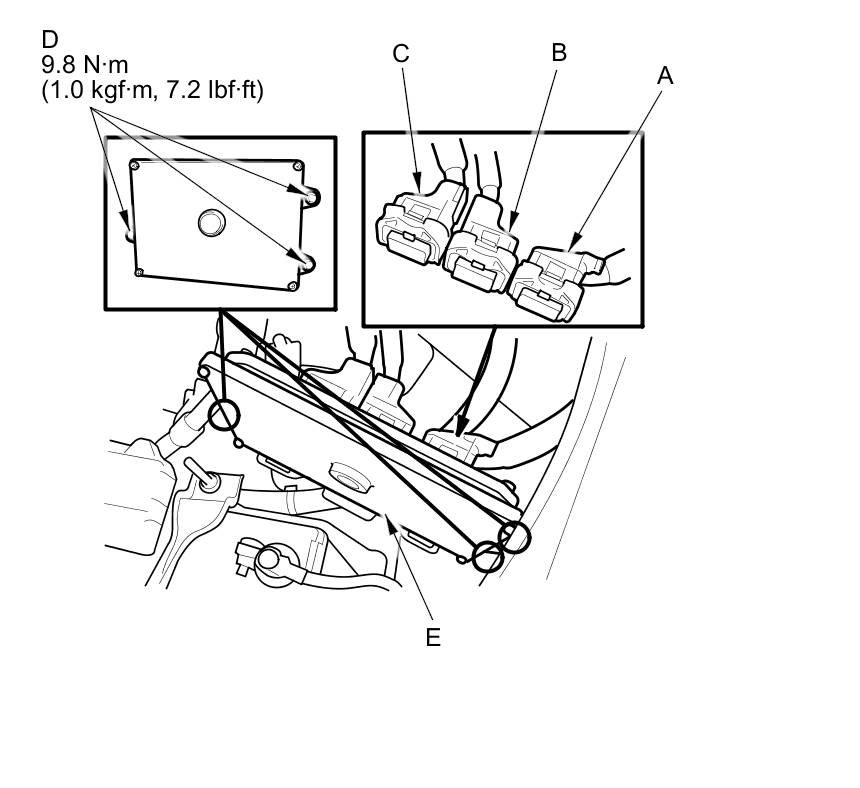 13. Disconnect PCM connectors A, B, and C, then remove the PCM (E).