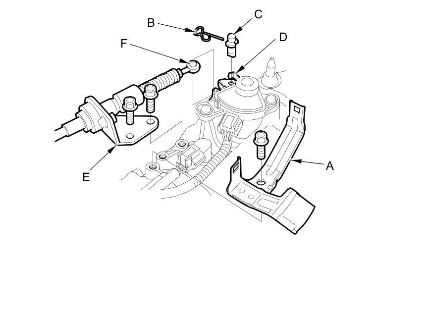 12. Apply molybdenum grease to the center of the shift cable end collar (A). Attach the shift cable end to the selector control lever (B). Insert the control pin (C) through the selector control lever hole (D), through the shift cable end hole, and into the selector control lever slotted hole (E) in the direction shown. Push the control pin until its flange (F) contacts the selector control lever surface.