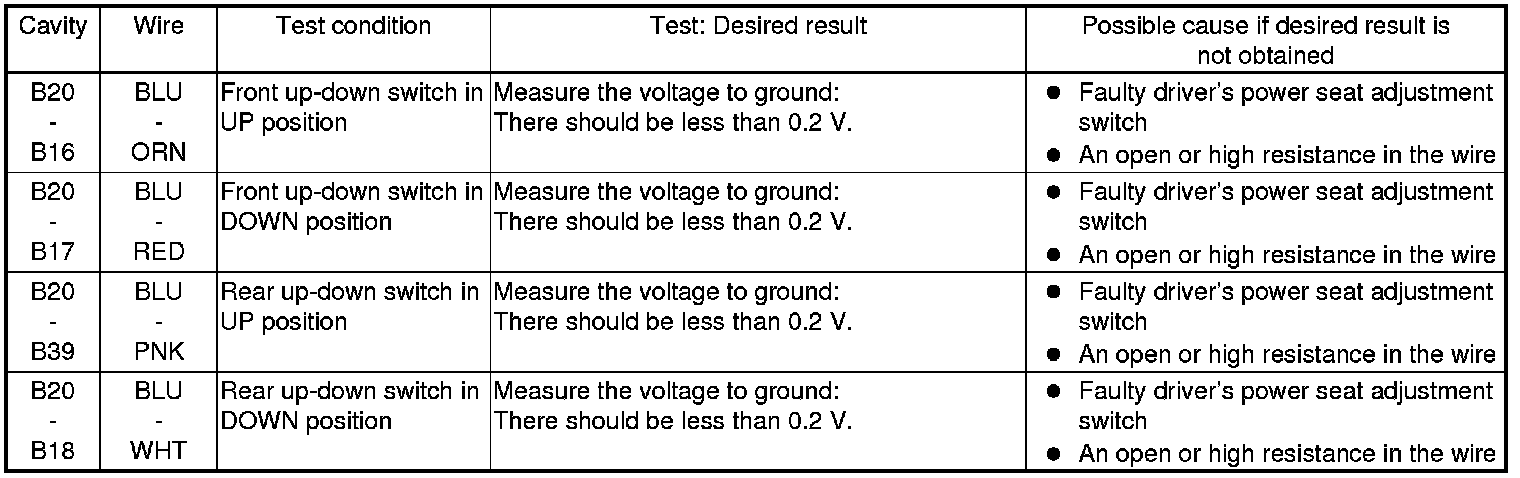 7. Disconnect the connectors from the power seat control unit, and do the following input tests: