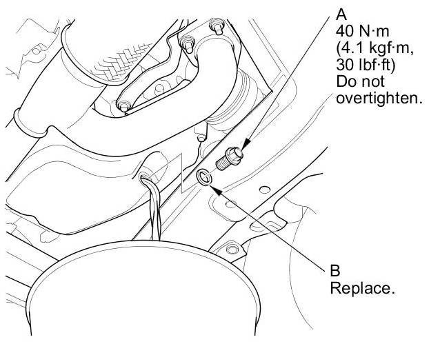 3. Reinstall the drain bolt with a new washer (B) and torque to specification.