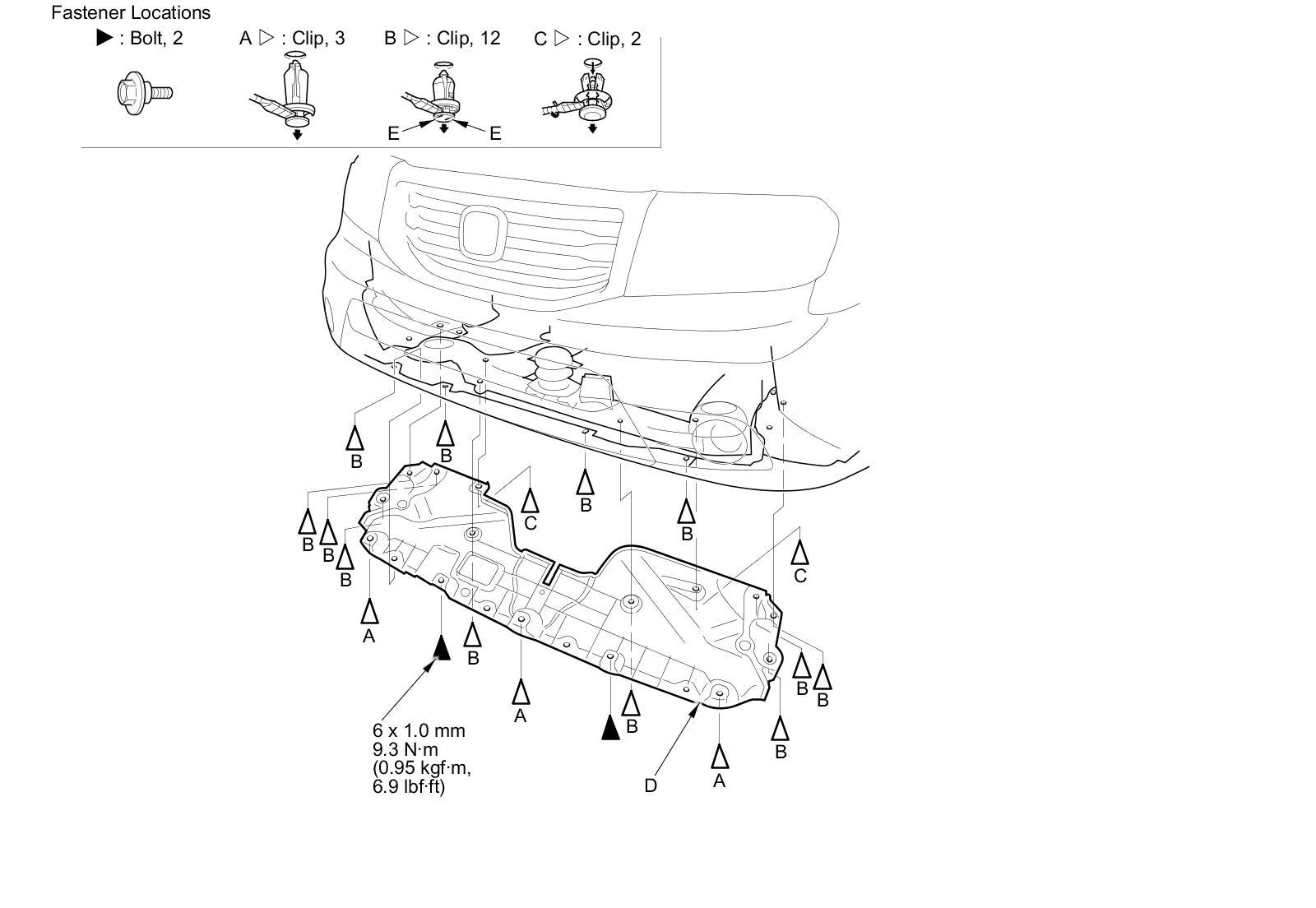 NOTE: To release the clips B, pry up on the center pin at the notch (E).