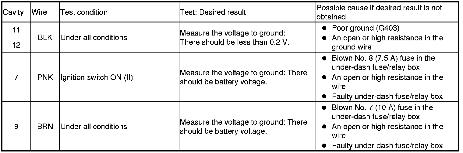NOTE: Before testing, troubleshoot the multiplex integrated control unit first, using B-CAN System Diagnosis Test Mode A Troubleshooting - B-CAN System Diagnosis Test Mode A.