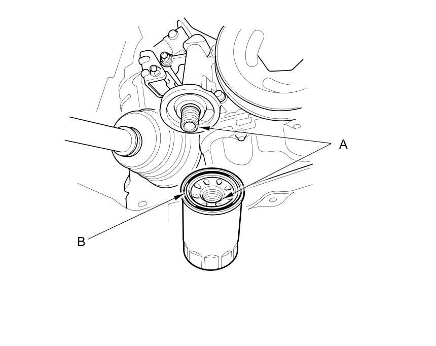 3. Inspect the threads (A) and the rubber seal (B) on the new filter. Clean the seat on the oil filter base, then apply a light coat of new engine oil to the oil filter rubber seal. Use only filters with a built-in bypass system.