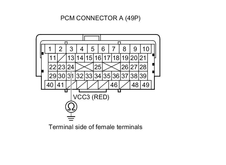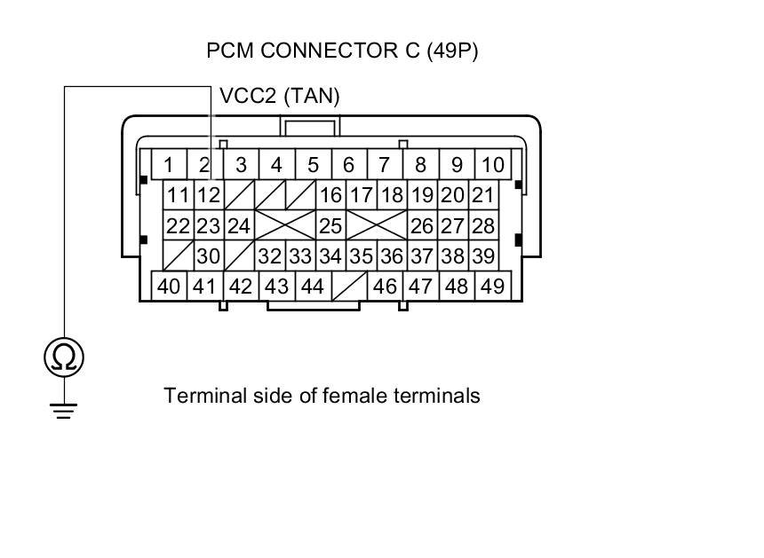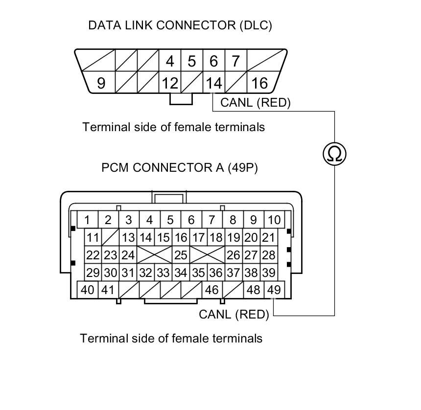 33. Check for continuity between PCM connector terminal A49 and DLC terminal No. 14.