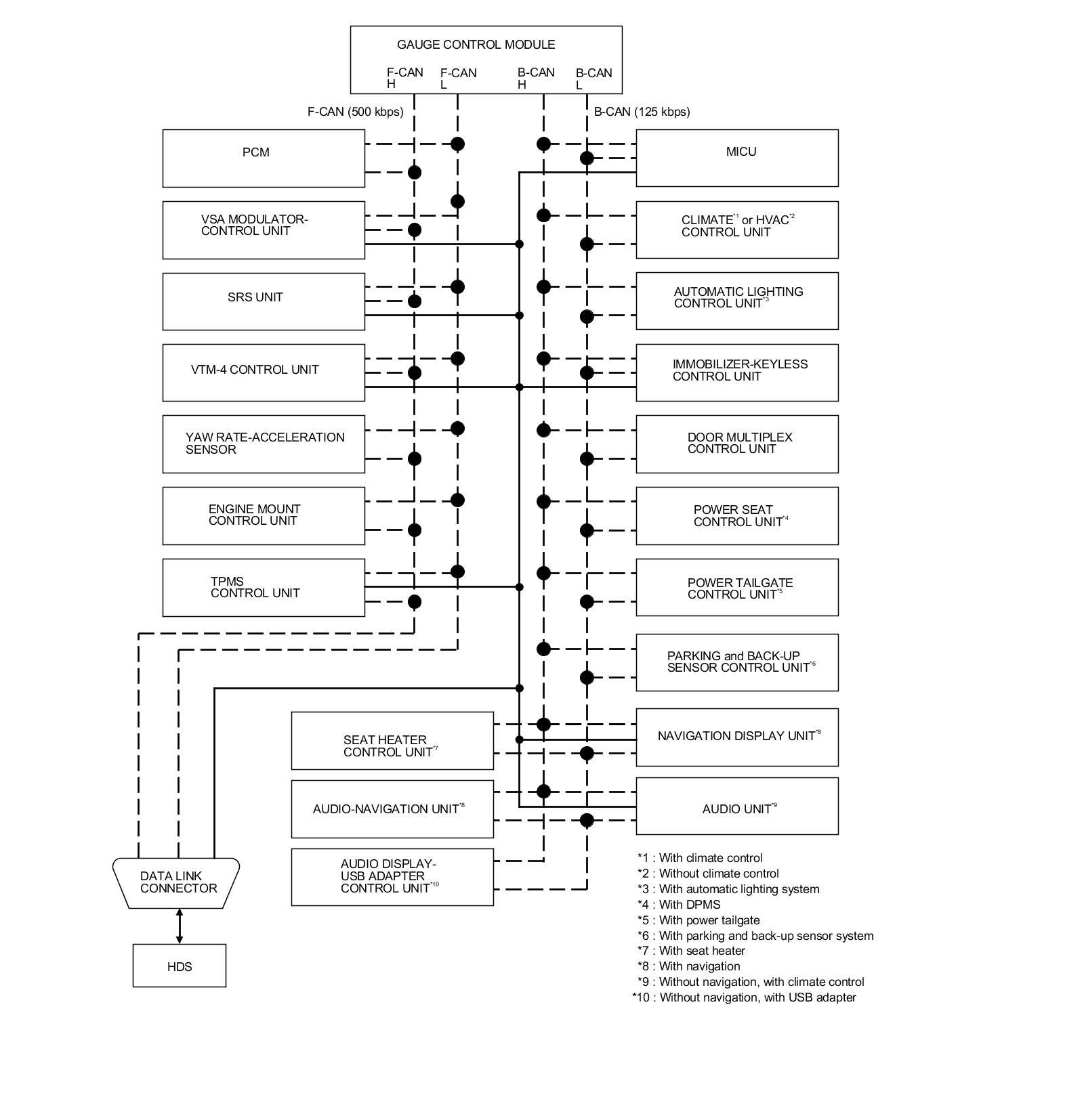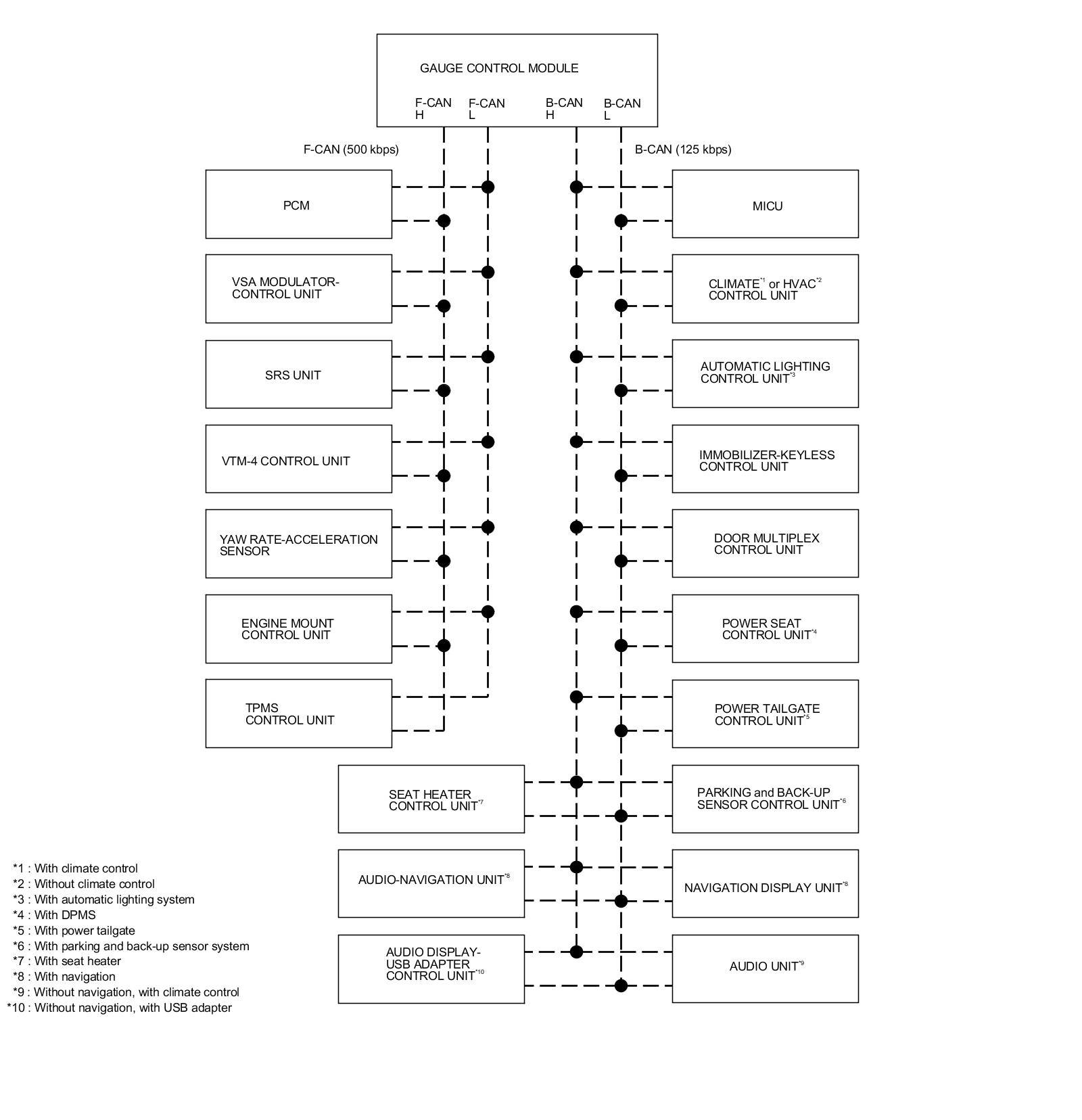 The body controller area network (B-CAN) and the fast controller area network (F-CAN) share information between multiple electronic control units (ECUs). B-CAN communication moves at a slower speed (125 kbps) for convenience related items and for other functions. F-CAN information moves at a faster speed (500 kbps) for "real time" functions such as fuel and emissions data. To allow both systems to share information, the gauge control module translates and relays the information from B-CAN to F-CAN and from F-CAN to B-CAN. This is called the Gateway Function.