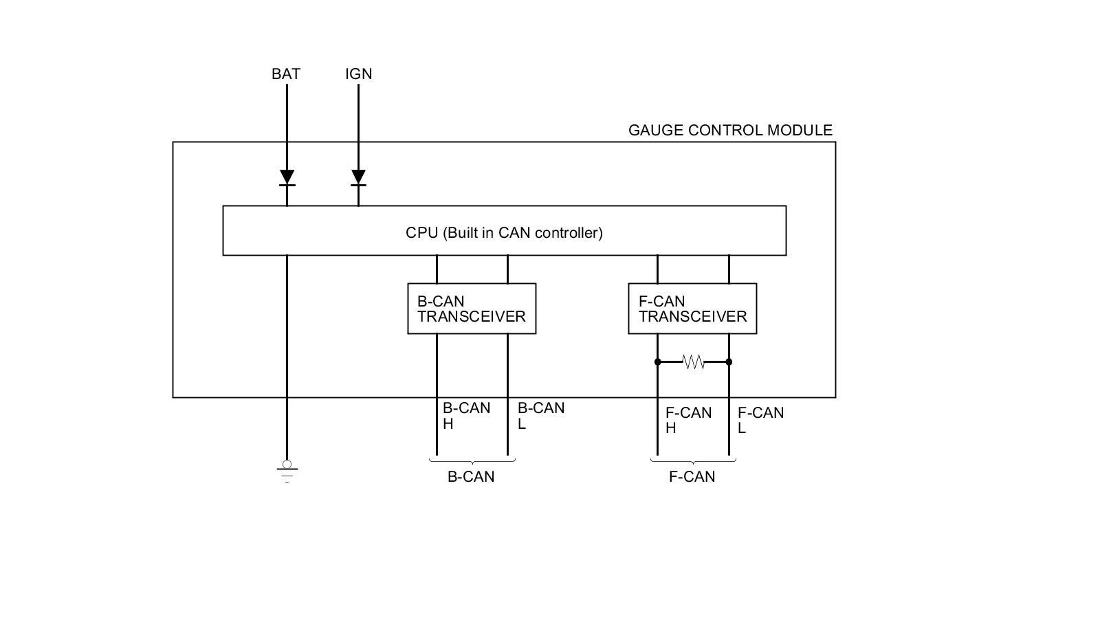 The gauge control module acts as a gateway to allow both systems to share information. The gauge control module translates and relays the information from B-CAN to F-CAN and from F-CAN to B-CAN.