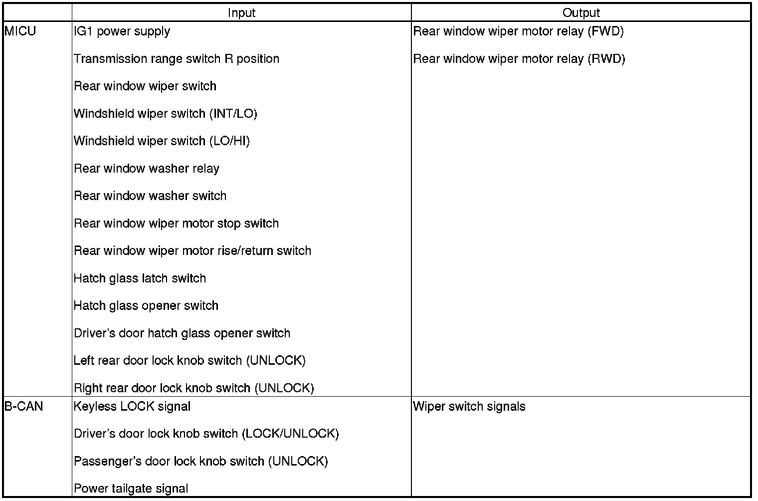 The MICU controls the rear window wiper motor and washer motor based on the wiper/washer switch inputs.