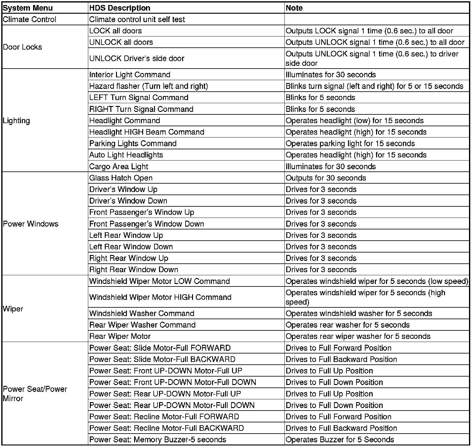 By connecting the HDS to the data link connector (DLC), the HDS can retrieve the diagnostic information from the MICU via a diagnostic line called the K-LINE. The K-LINE is separated communication line from the CAN lines, but it is connected to most of the CAN related ECUs. The MICU is a gateway between the HDS and B-CAN related ECUs, and sends B-CAN diagnostic information to the HDS. When doing a function test with the HDS, the HDS sends an output signal through the K-LINE to the MICU. The MICU either relays the request to another ECU, or commands the function.