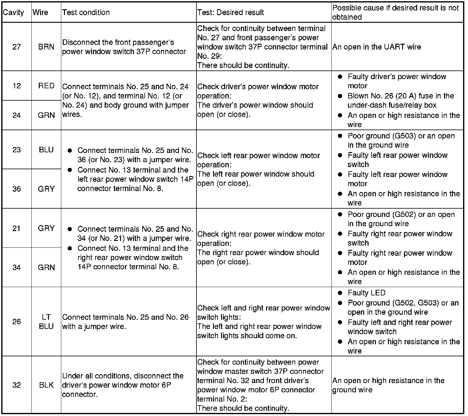 4. With the door multiplex control unit 37P connector still disconnected from the power window master switch, do the following input tests.
