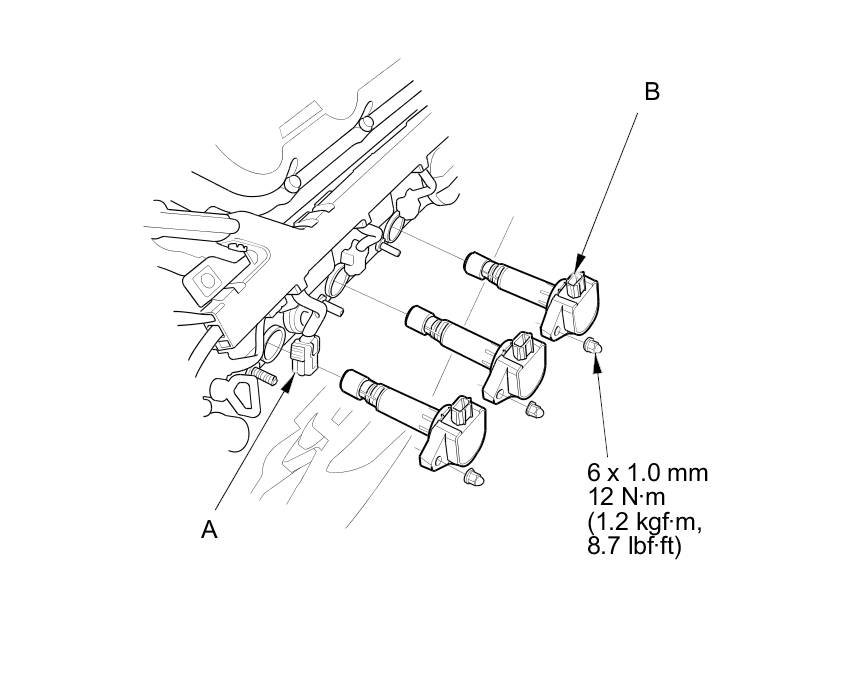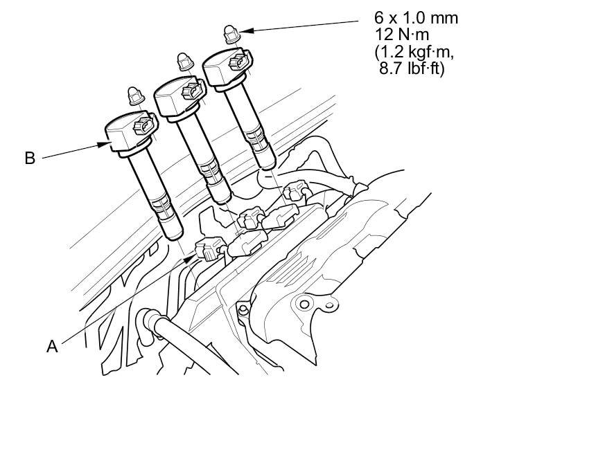 2. Disconnect the ignition coil connectors (A), then remove the ignition coils (B).