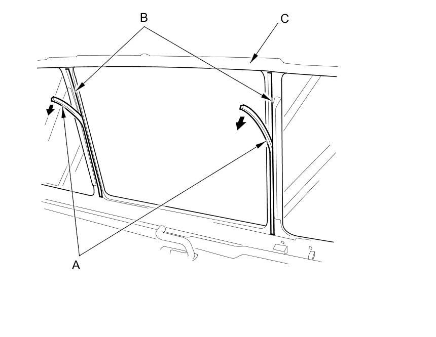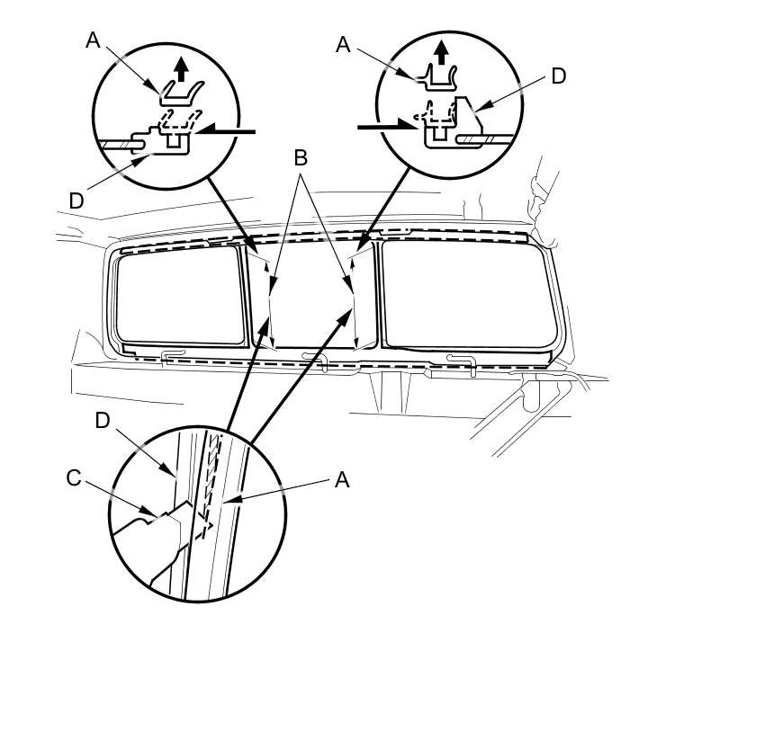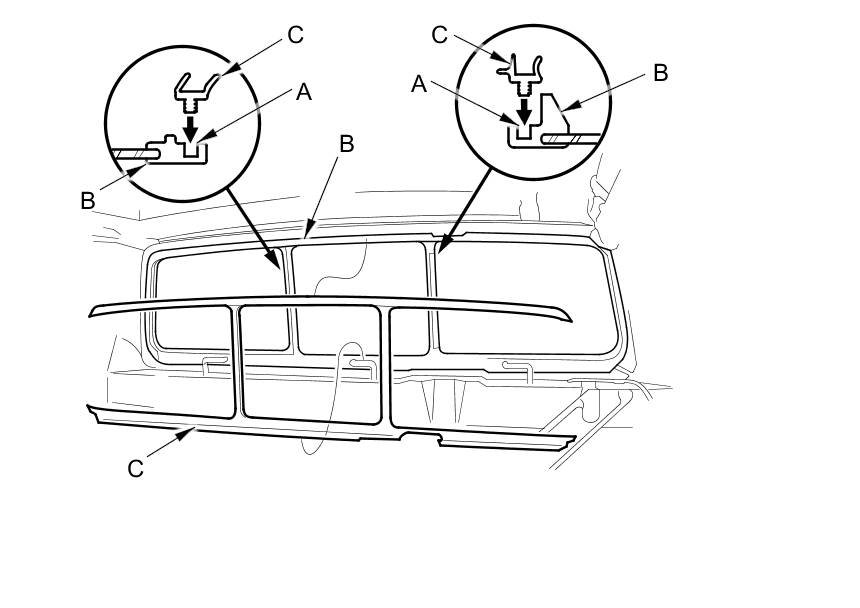 6. Apply a light coat of primer to the groove areas (A) of the back window molding (B). Install the glass run channel (C) to the top and bottom groove areas of the molding, and then attach the glass run channel to the middle glass areas of the molding with structural adhesive (3M DP8005).
