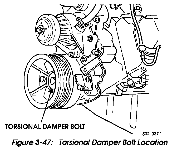 2. Using torsional damper bolt (Figure 3-47),rotate crankshaft to bring affected piston to TDC position.