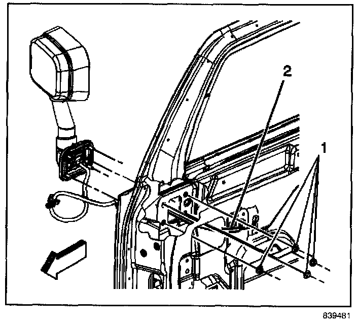 4. Remove the fasteners (1) retaining the mirror to the door.