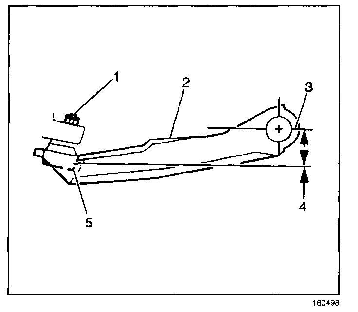 5. Measure from the pivot bolt center line (3) down to the lower corner (5) of the lower ball joint (1) in order to obtain the Z height measurement (4).