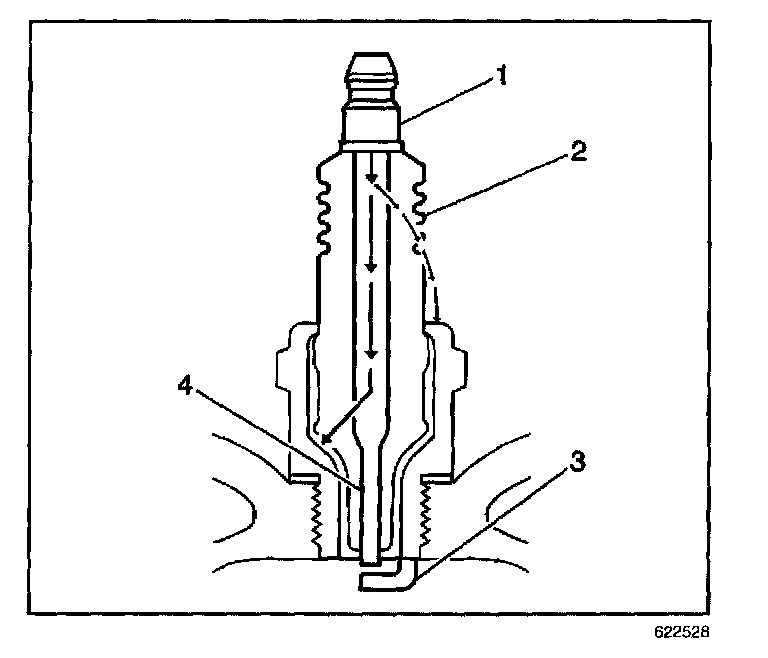 - Inspect the insulator (2) for cracks. All or part of the electrical charge may arc through the crack instead of the electrodes (3, 4).
