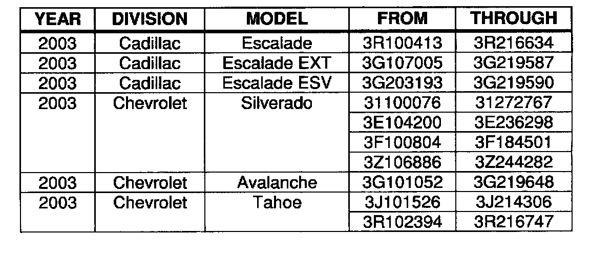 Involved are certain 2003 model year Cadillac Escalade, Escalade EXT, and Escalade ESV; Chevrolet Silverado, Avalanche, Tahoe, and Suburban; GMC Sierra, Yukon, and Yukon XL; and HUMMER H2 vehicles built within these VIN breakpoints shown.