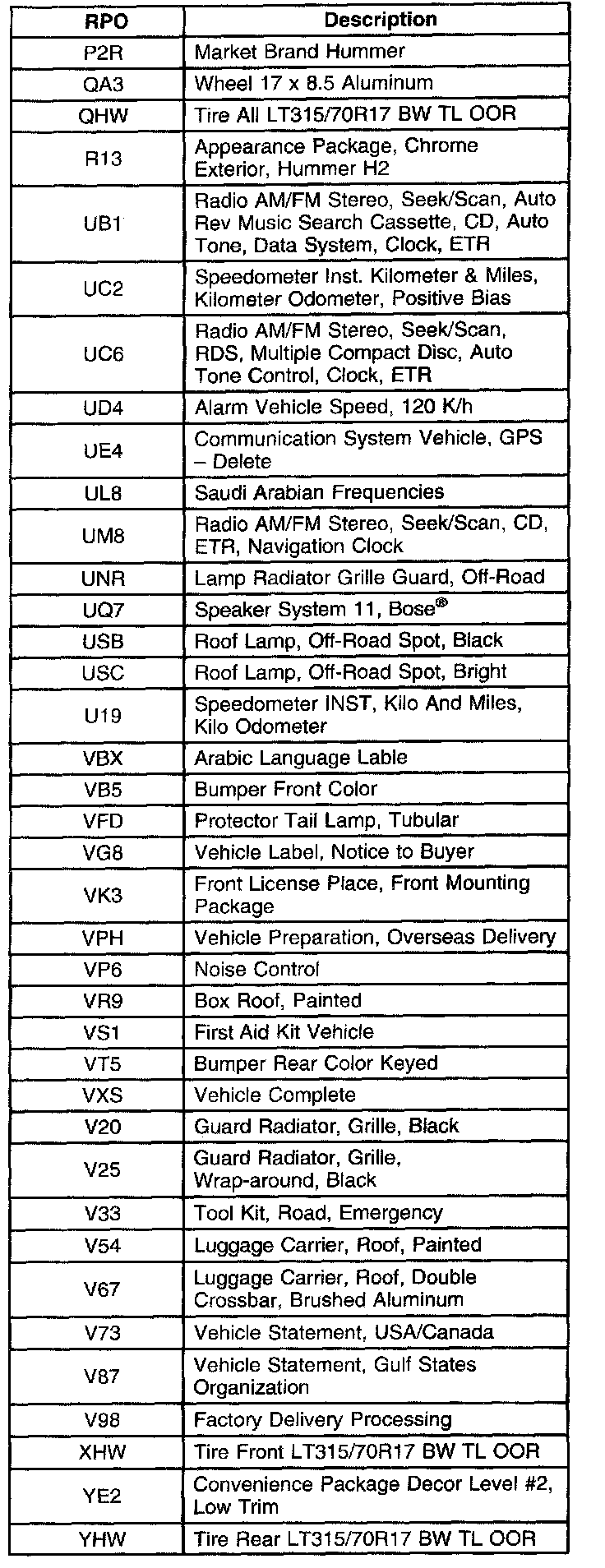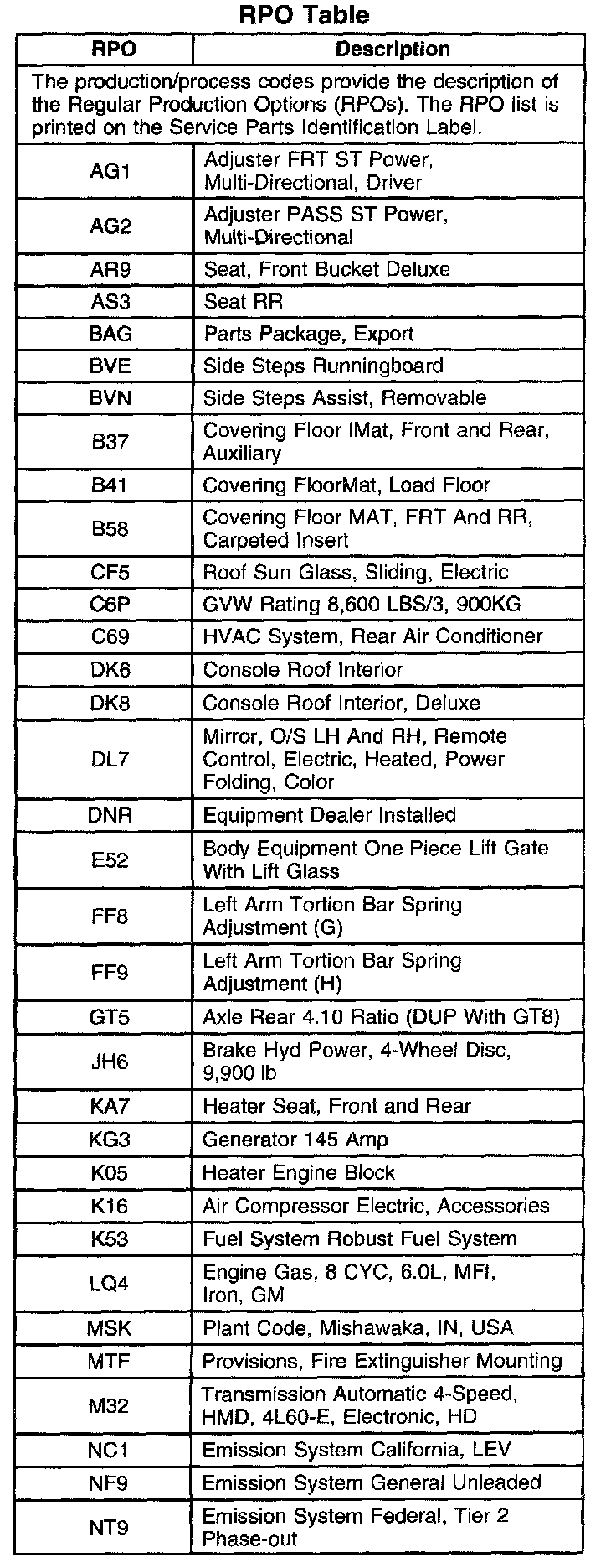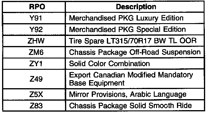 RPO Code List