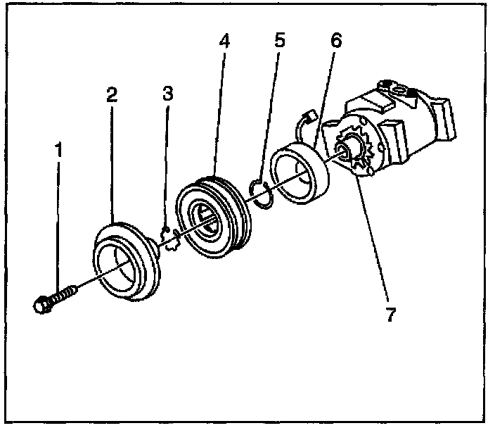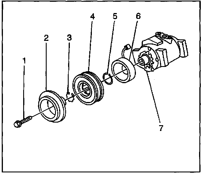 13. Remove the clutch coil (6) from the A/C compressor (7).