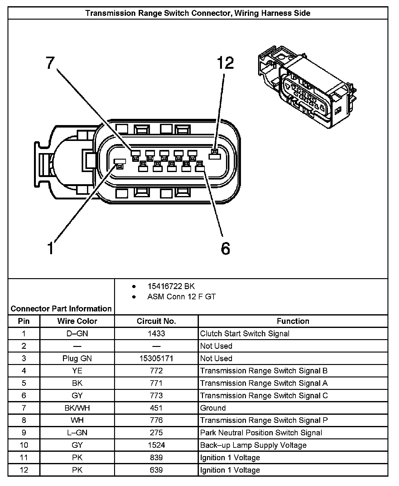 Transmission Range Switch Connector, Wiring Sensor Side: