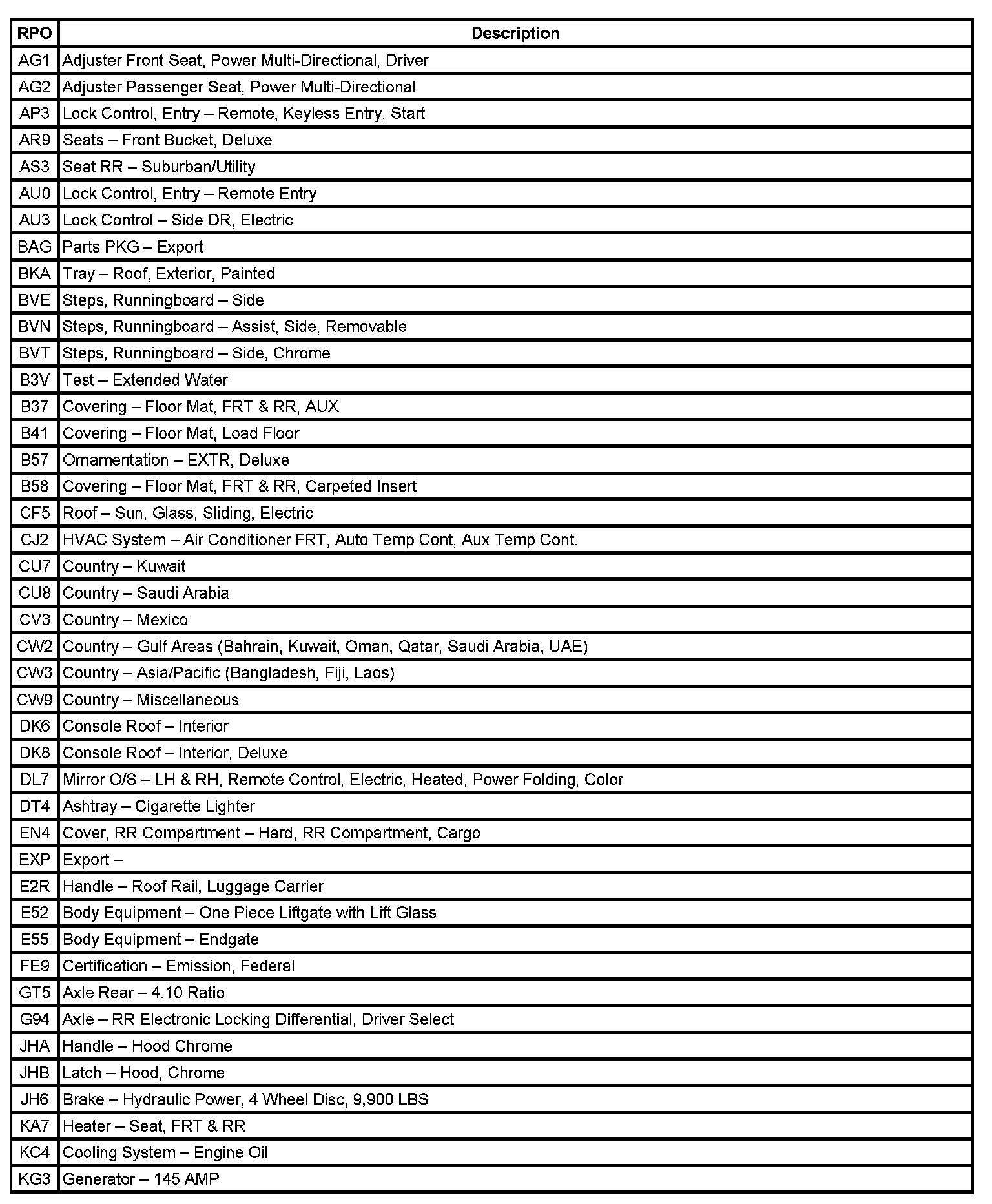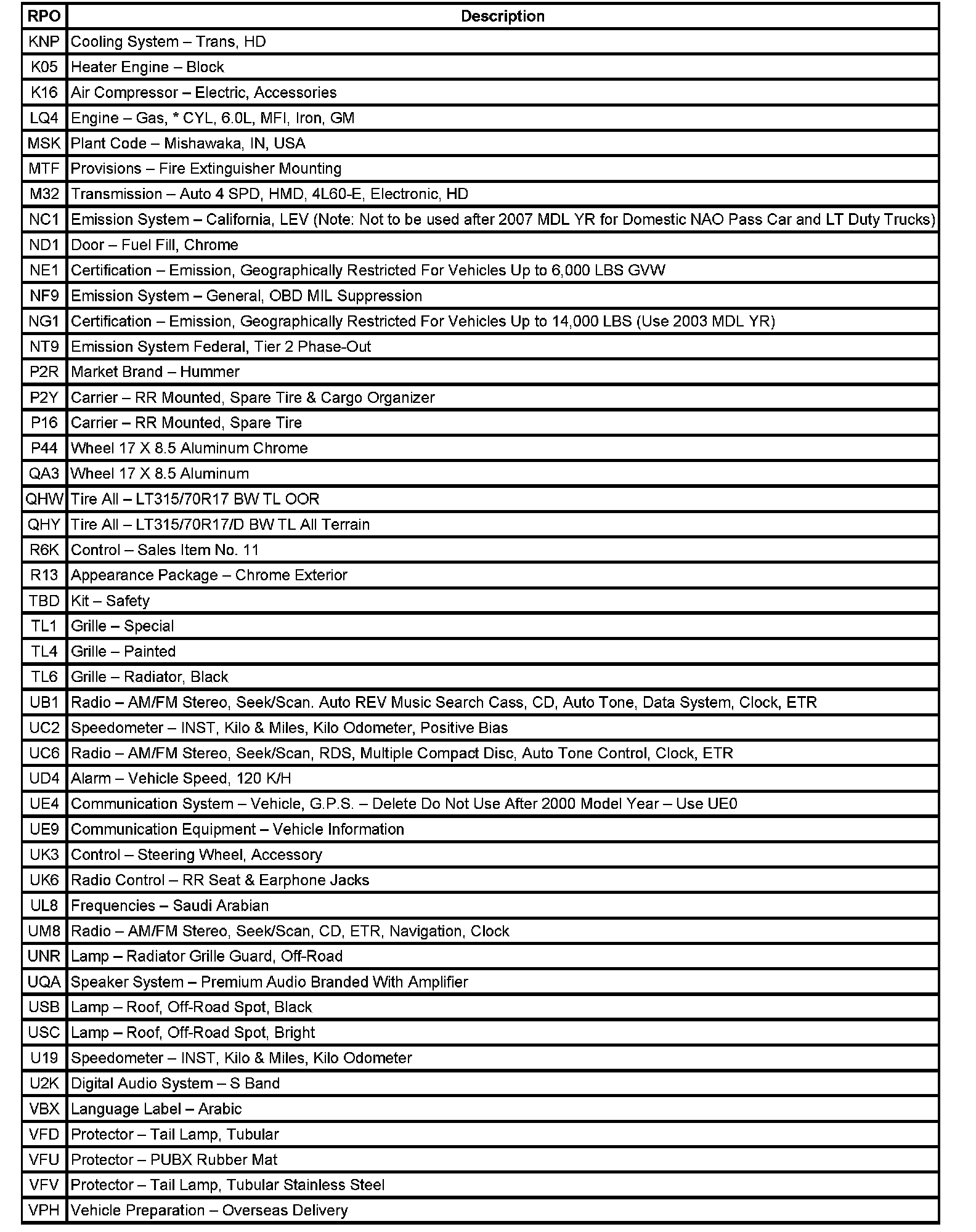 RPO Code List