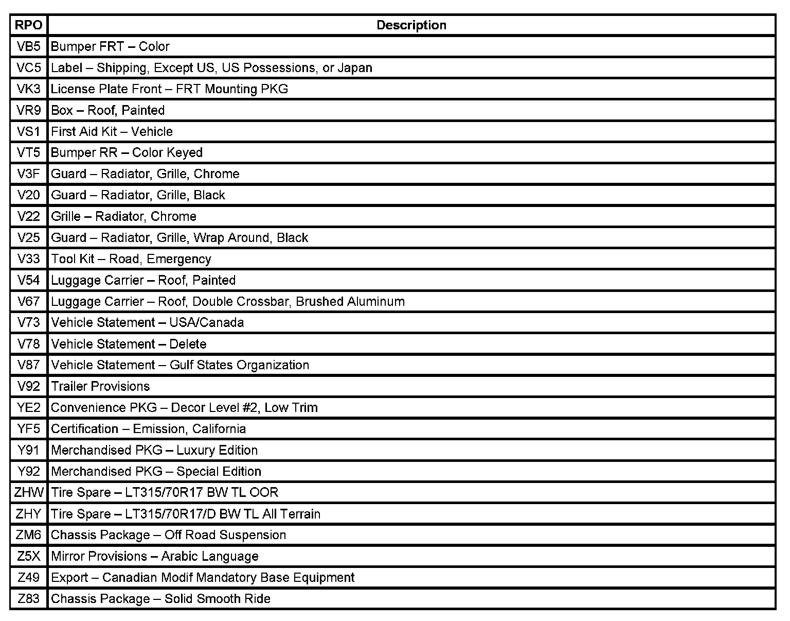 RPO Code List (Part 1):
