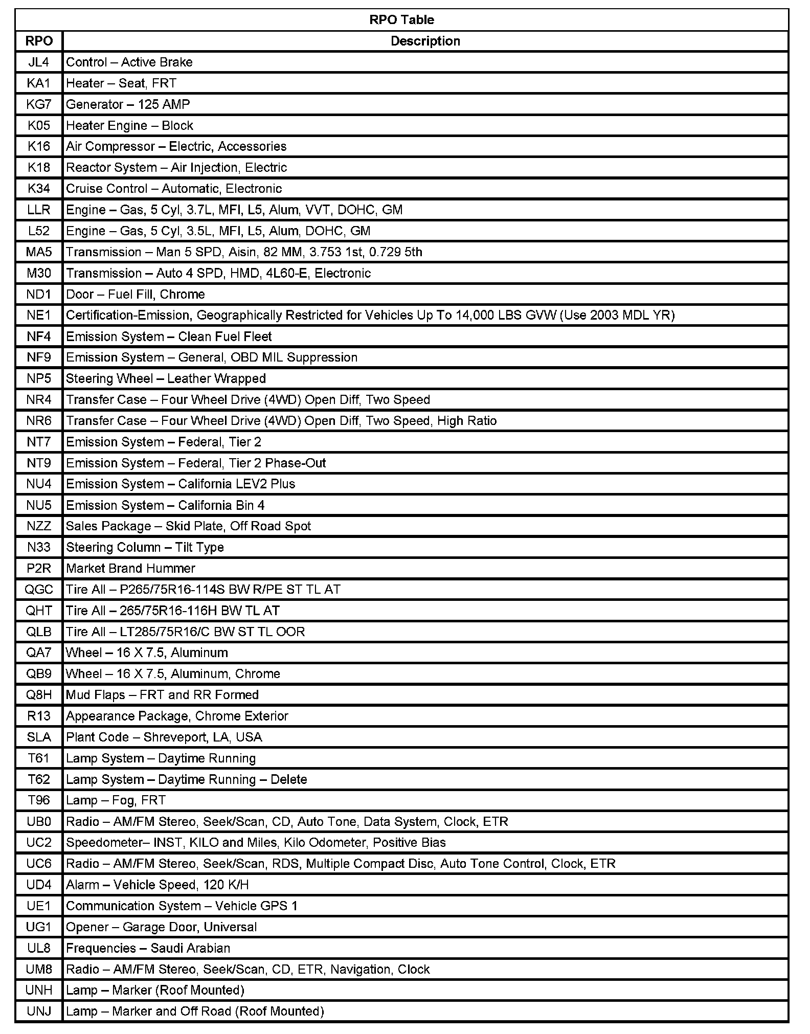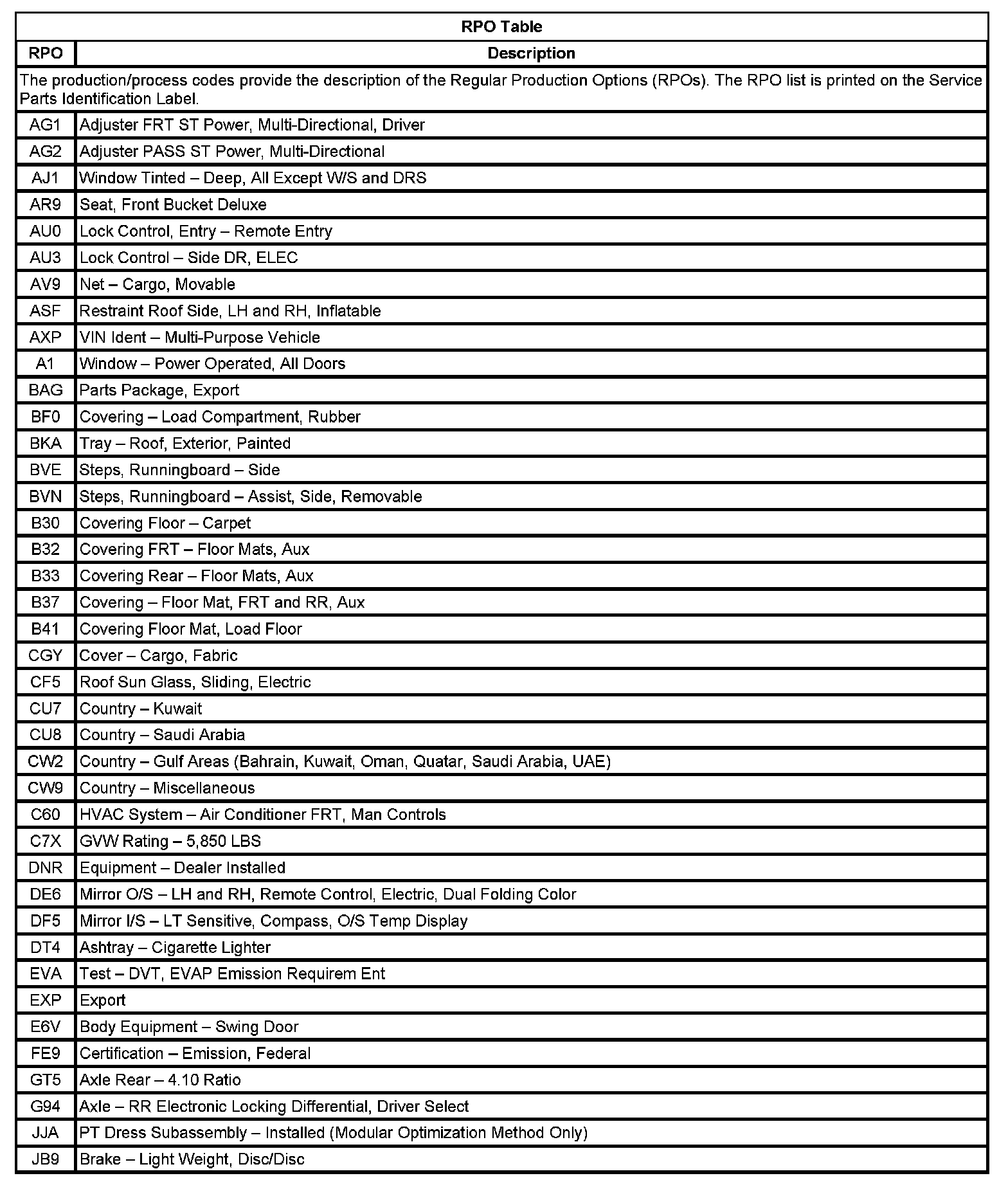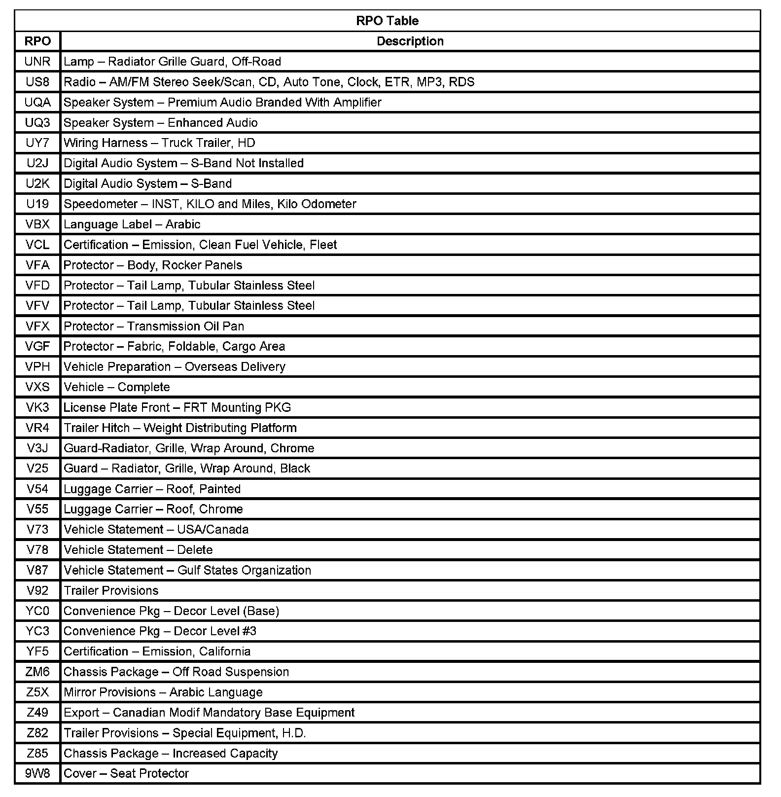 RPO Code List