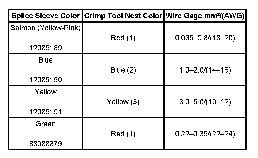 4. Select the proper duraseal splice sleeve according to the wire size. Refer to the above table at the beginning of the repair procedure for the color coding of the duraseal splice sleeves and the crimp tool nests.
