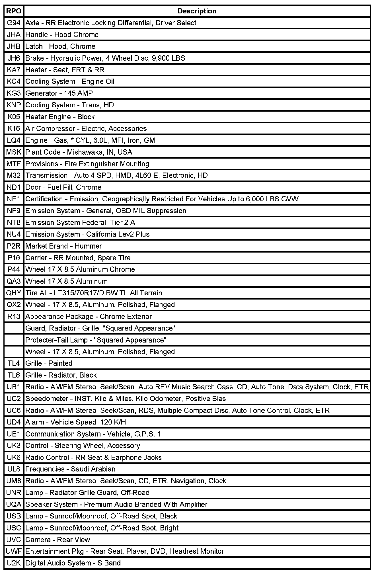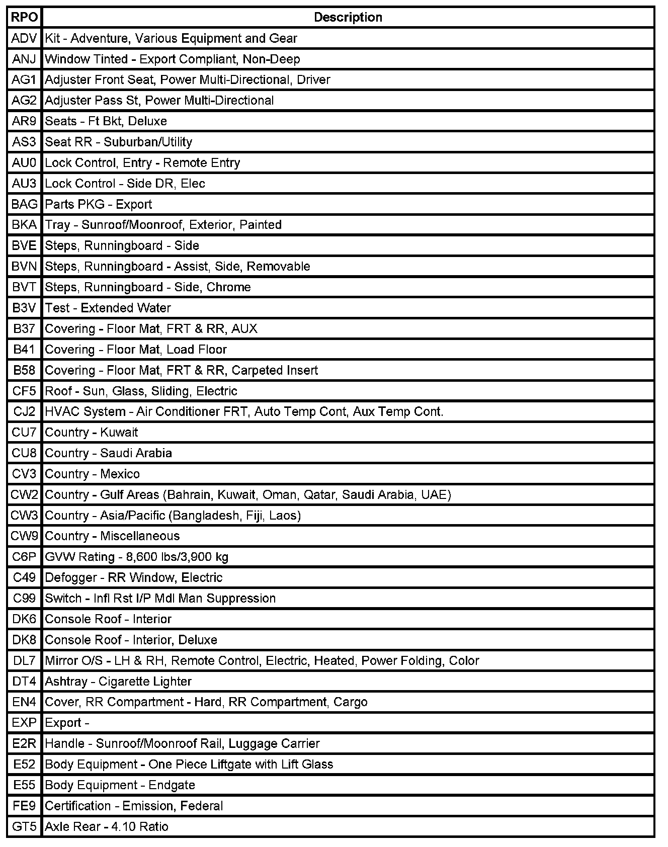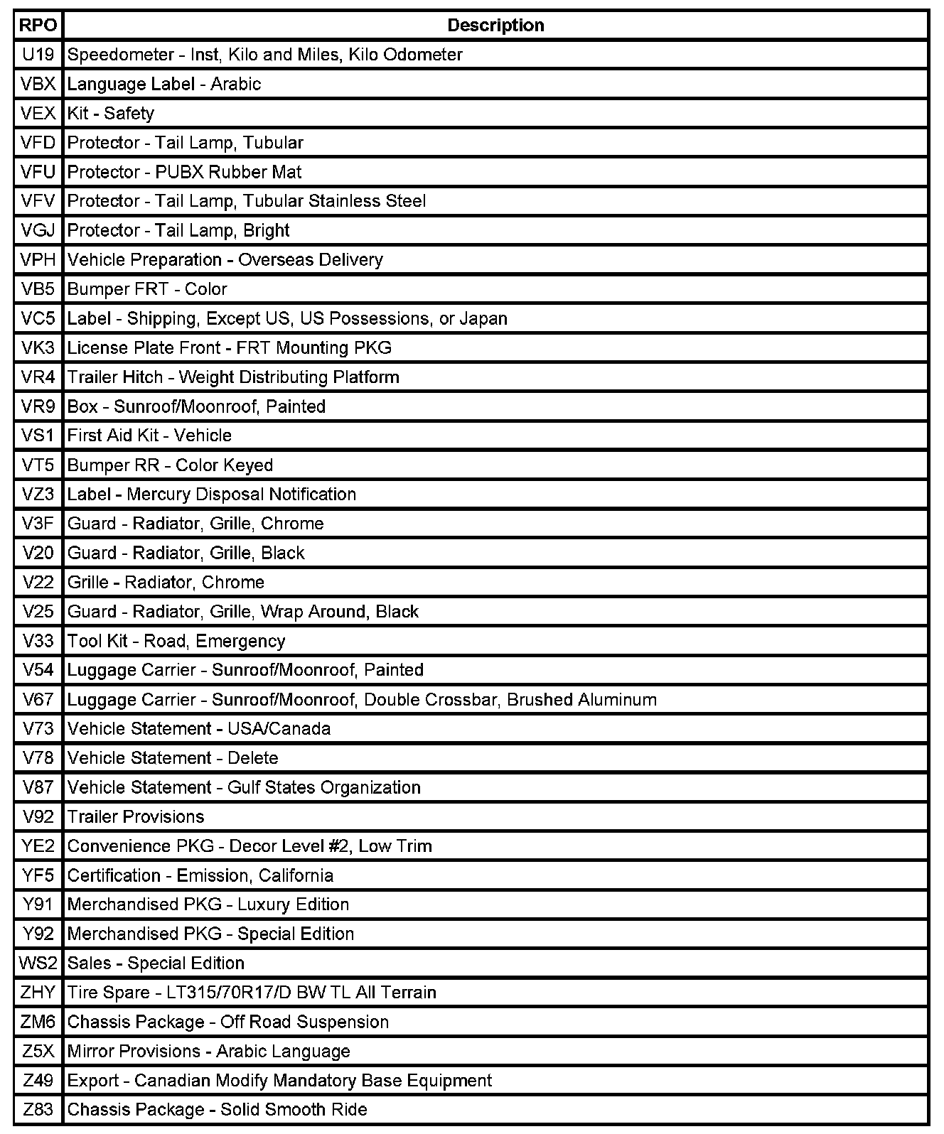 RPO Code List
