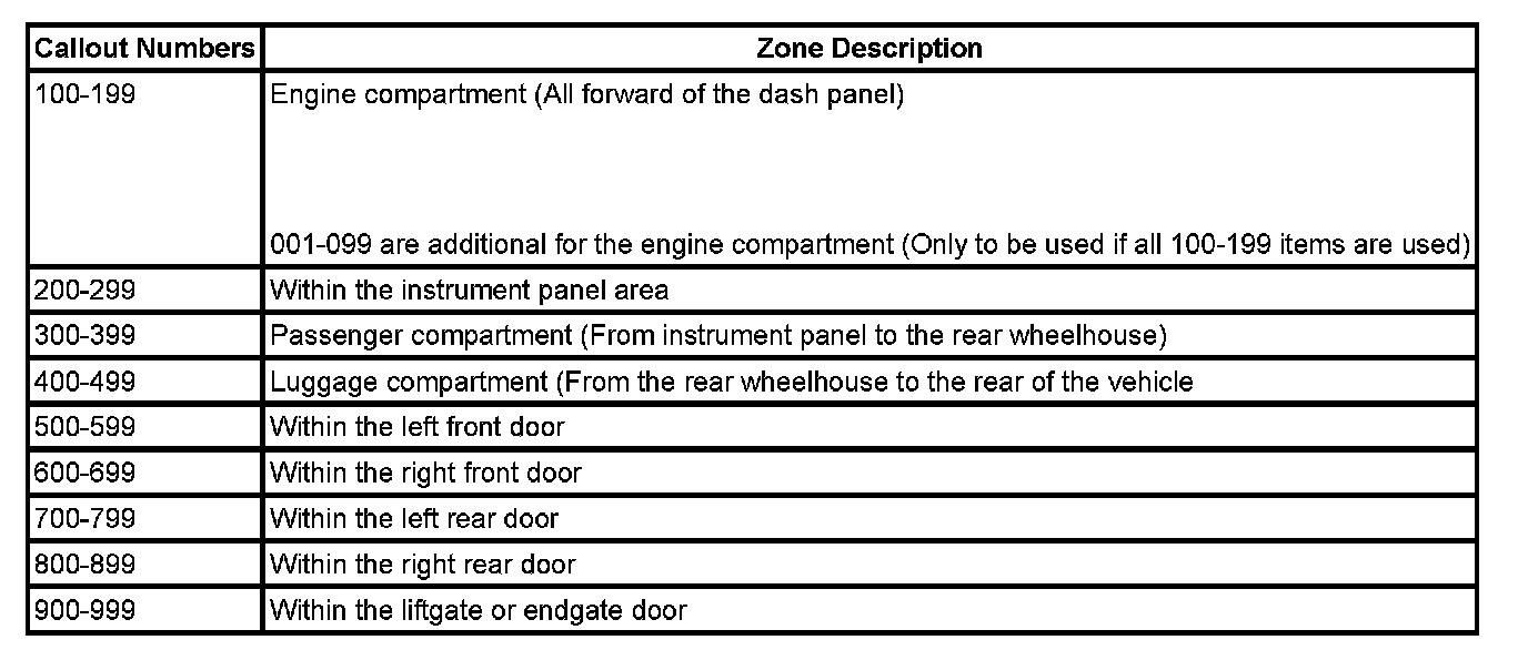 All grounds, in-line connectors, pass-through grommets, and splices have identifying numbers that correspond to where they are located in the vehicle. The following table explains the numbering system.