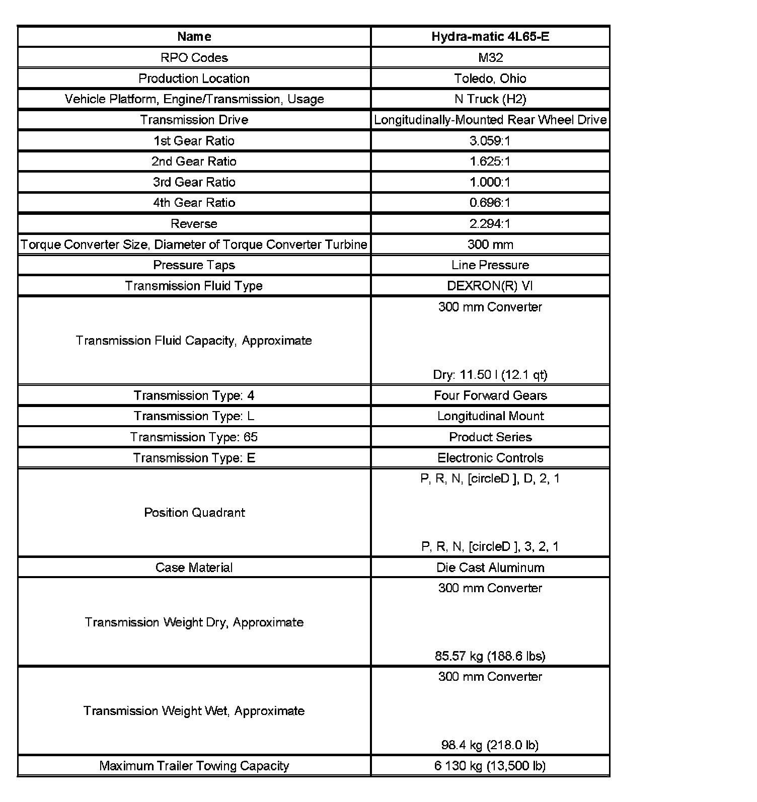 Transmission General Specifications: