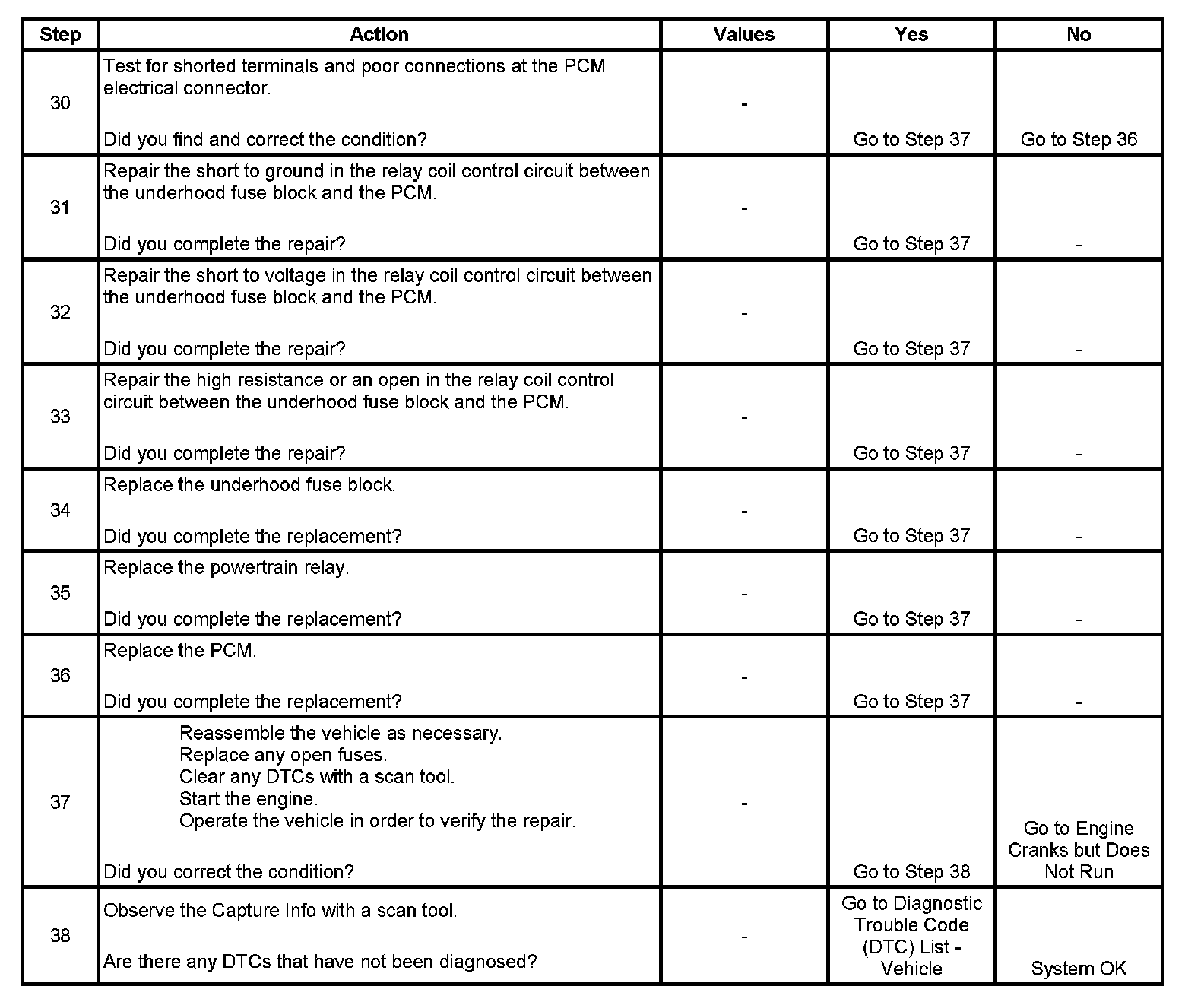 If the powertrain relay fails to close the engine will crank, but will not run. The PCM class 2 communications will be available with the use of a scan tool.