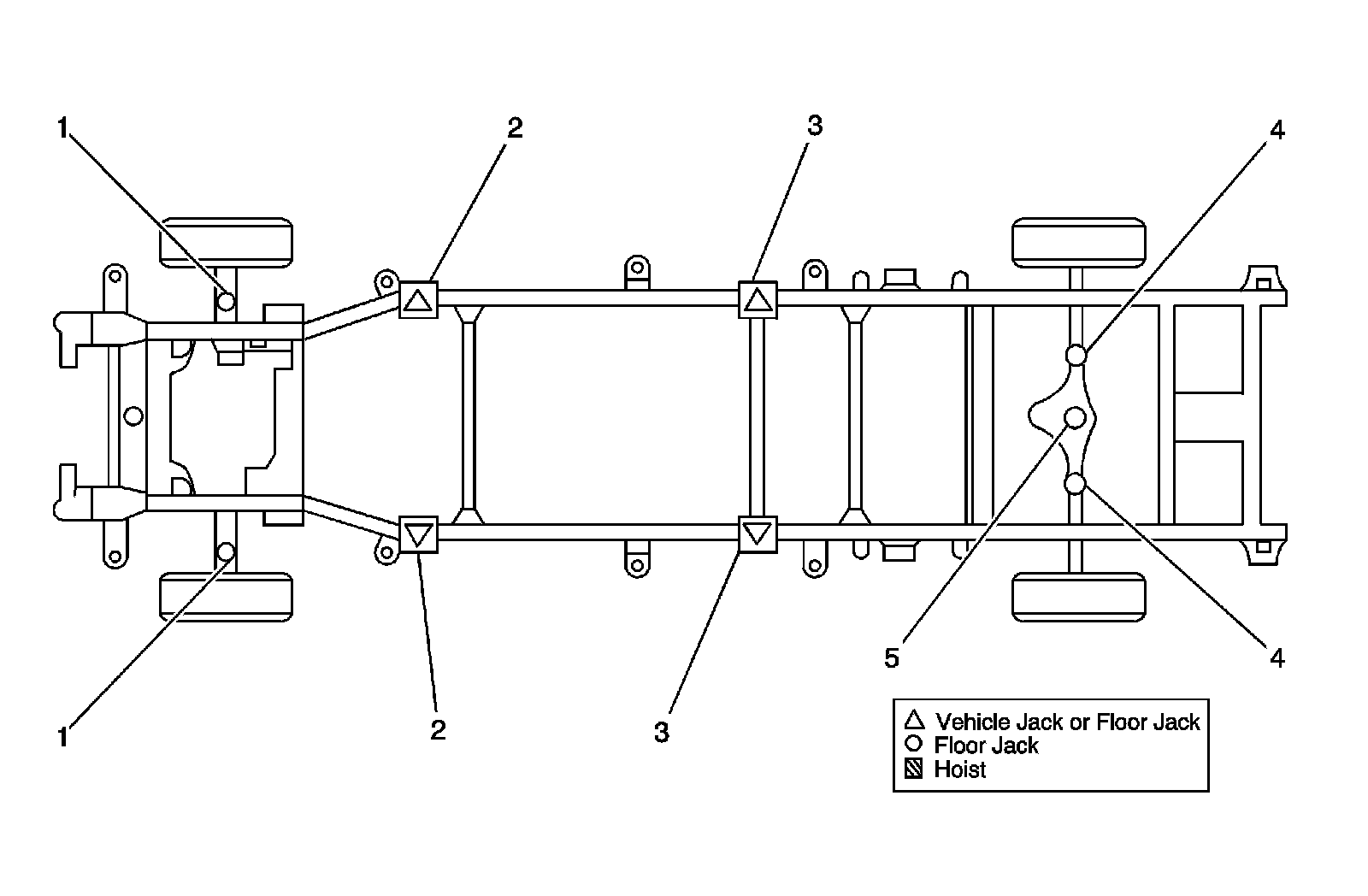 For lifting the vehicle, various lift points are recommended. Before you begin any lifting procedure, place the vehicle on a clean, hard, level surface. Verify that all the lifting equipment meets weight standards and is in good working order. Verify that all of the vehicle loads are equally distributed and secure. If you are only supporting the vehicle at the frame side rails, verify that the lifting equipment does not put too much stress on, or weaken, the frame side rails.