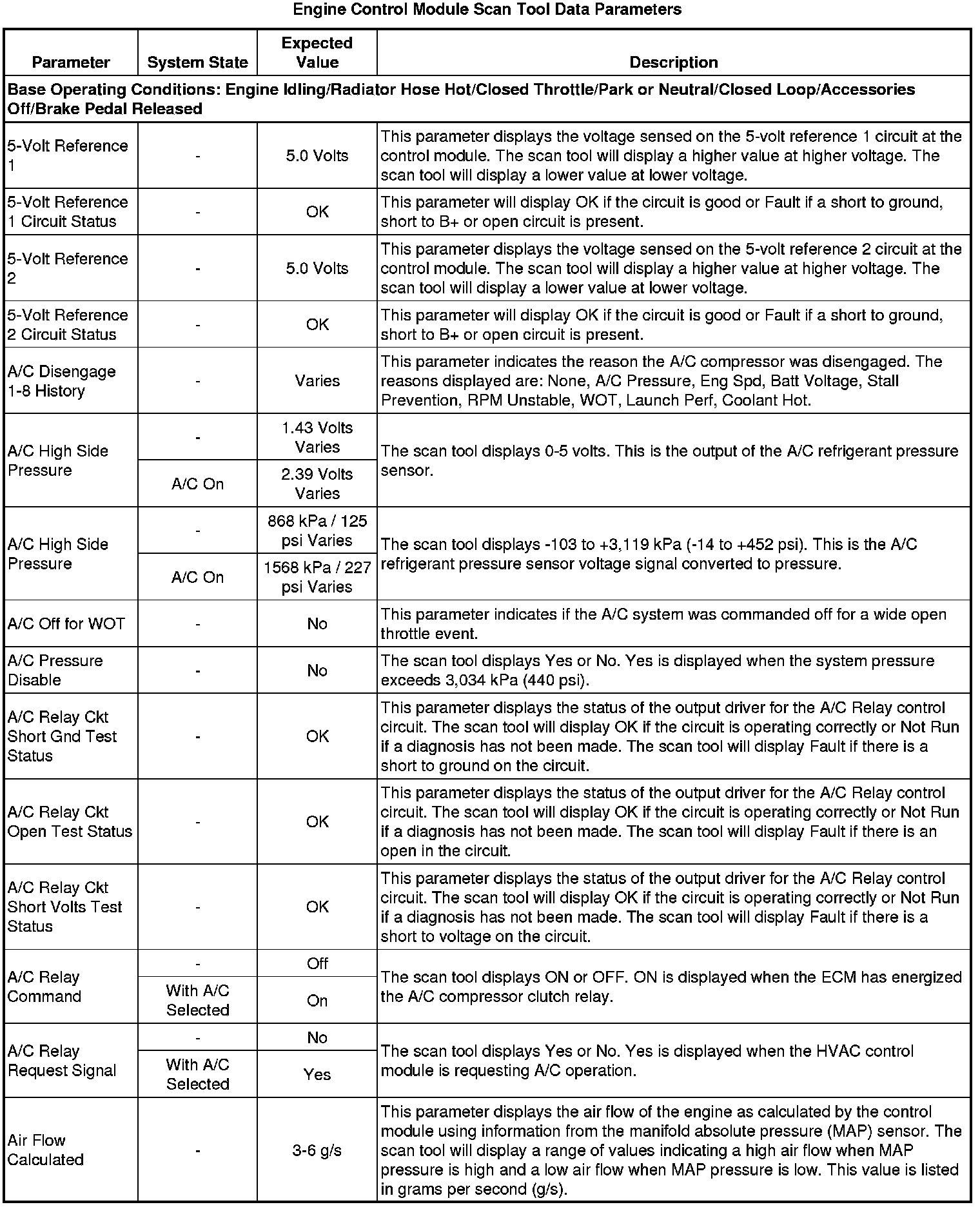 The Engine Control Module Scan Tool Data List contains all engine-related parameters that are available on the scan tool. The list is arranged in alphabetical order. A given parameter may appear in any one of the data lists, and in some cases may appear more than once, or in more than one data list in order to group certain related parameters together.