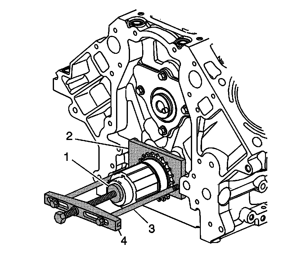 6. Use the J 41816-2 (1), the J 41558 (2), bolts (3), and the J 8433 (4) in order to remove the crankshaft sprocket.