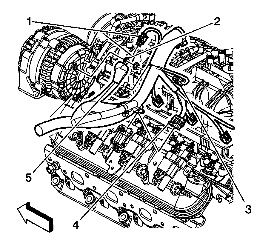 5. Reposition the engine wiring harness/positive battery cable boot (5).