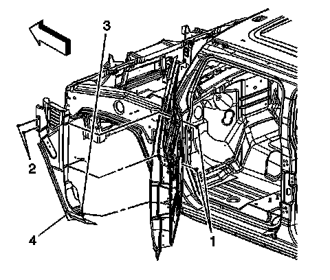 3. Remove the fender flare. Refer to Front Wheel Opening Flare Replacement (Base) ()Front Wheel Opening Flare Replacement (WS2, BVX, Upper) ()Front Wheel Opening Flare Replacement (WS2, BVX, Lower) ().
