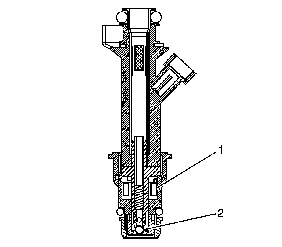 The fuel injector assembly is a solenoid device controlled by the control module that meters pressurized fuel to a single engine cylinder. The control module energizes the high-impedance, 12 ohms, injector solenoid (1) to open a normally closed ball valve (2). This allows fuel to flow into the top of the injector, past the ball valve, and through a director plate at the injector outlet. The director plate has four machined holes that control the fuel flow, generating a spray of finely atomized fuel at the injector tip. Fuel from the injector tip is directed at the intake valve, causing the fuel to become further atomized and vaporized before entering the combustion chamber. This fine atomization improves fuel economy and emissions.