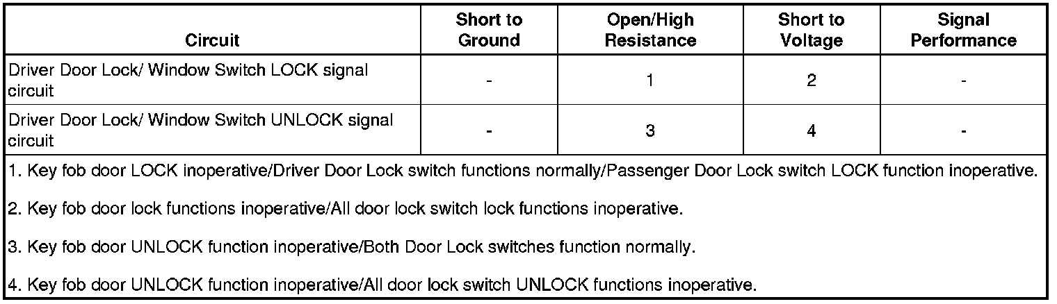 • If the door locks do not LOCK, test for a short to voltage or open/high resistance in the Driver Door Lock/ Window Switch LOCK signal circuit.