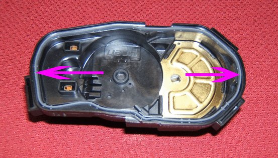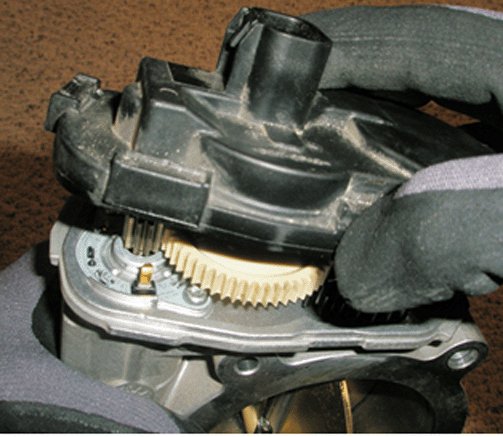 12. Maintain the throttle body in an upward position. Use your thumb to maintain contact with the intermediate gear. => If the intermediate gear falls out and impacts a hard workbench surface or the floor, abort this procedure and REPLACE with a new throttle body assembly.
