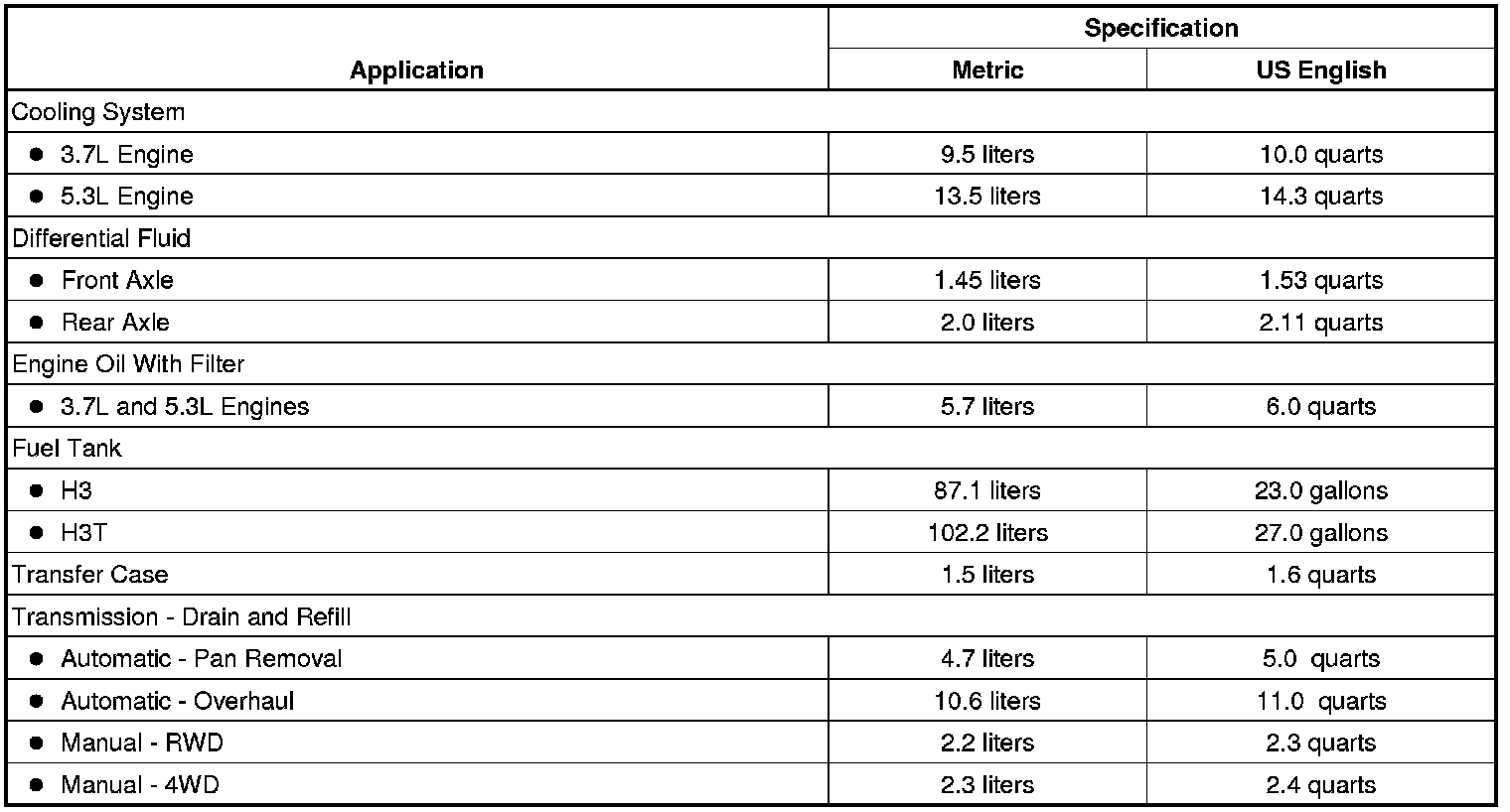 Home >> Hummer >> 2010 >> H3 L5-3.7L >> Repair and Diagnosis >> Specifications >> Capacity Specifications >> Maintenance