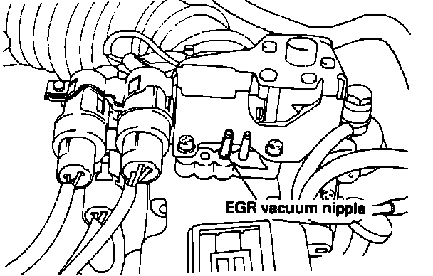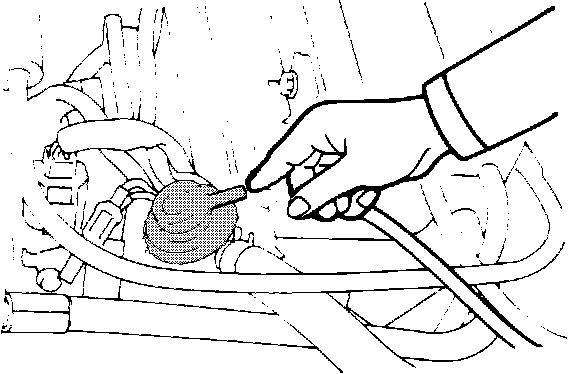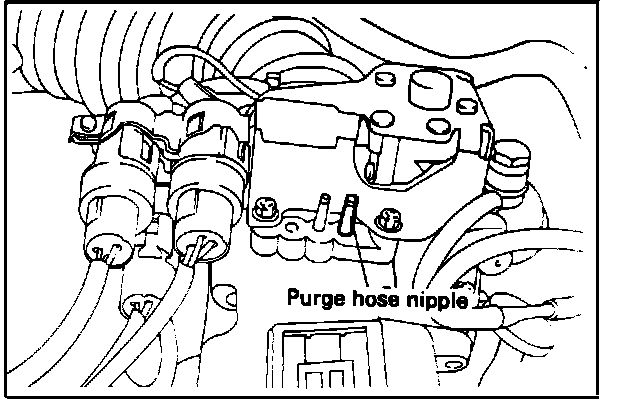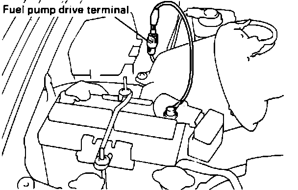 The fuel pump drive terminal (shown hooked-up) is located on the right side of the engine compartment behind the air cleaner housing.