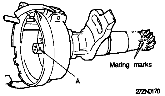10. Make a position identification mark on the distributor shaft (for the drive gear, to prevent 180° out of alignment, reassembly).