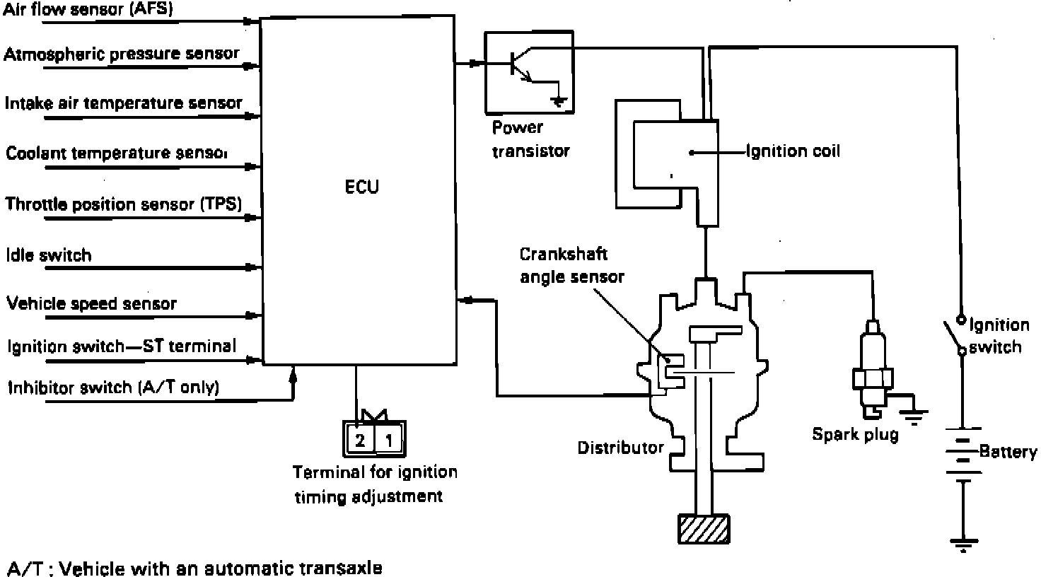 The Ignition Timing Control System operates by the ECU controlling the ignition timing through the power transistor. The ECU uses all of the engine condition and vehicle operating condition sensors (during normal driving conditions) to compute the correct spark advance or retard (during engine cranking, the ignition timing is fixed at 5°BTDC). The ECU uses the power transistor to control the ignition spark.
