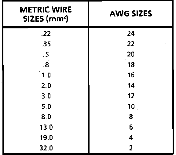 When replacing a wire, use a wire of the same size as the original wire or larger. The schematics list wire size in metric units. See table, Fig. 6, for the commercial (AWG) wire sizes that can be used to replace each metric wire size. Each AWG size is either equal to or larger than the equivalent metric size. To find the correct wire size either find the wire on the schematic and convert the metric size to the AWG size, or use an AWG wire gage. If you aren't sure of the wire size, start with the largest opening in the wire stripper and work down until a clean strip of the insulation is removed. Be careful to avoid nicking or cutting any of the wires.