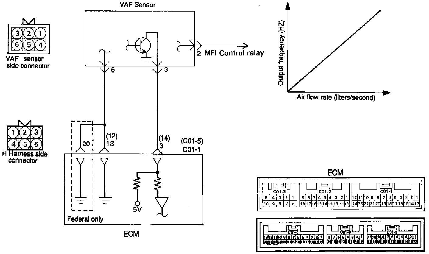 2. If the VAF Sensor output frequency is other than 0 when the ignition switch is turned on (do not start the engine), Check for the faulty VAF Sensor or ECM.