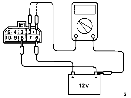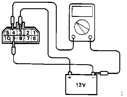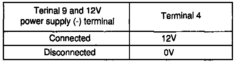 3. Connect a 12V power supply (+) terminal to the terminal 3 of the MFI control relay and measure the voltages at the terminal 4 when the (-) terminal is connected to and disconnected from the terminal 9.